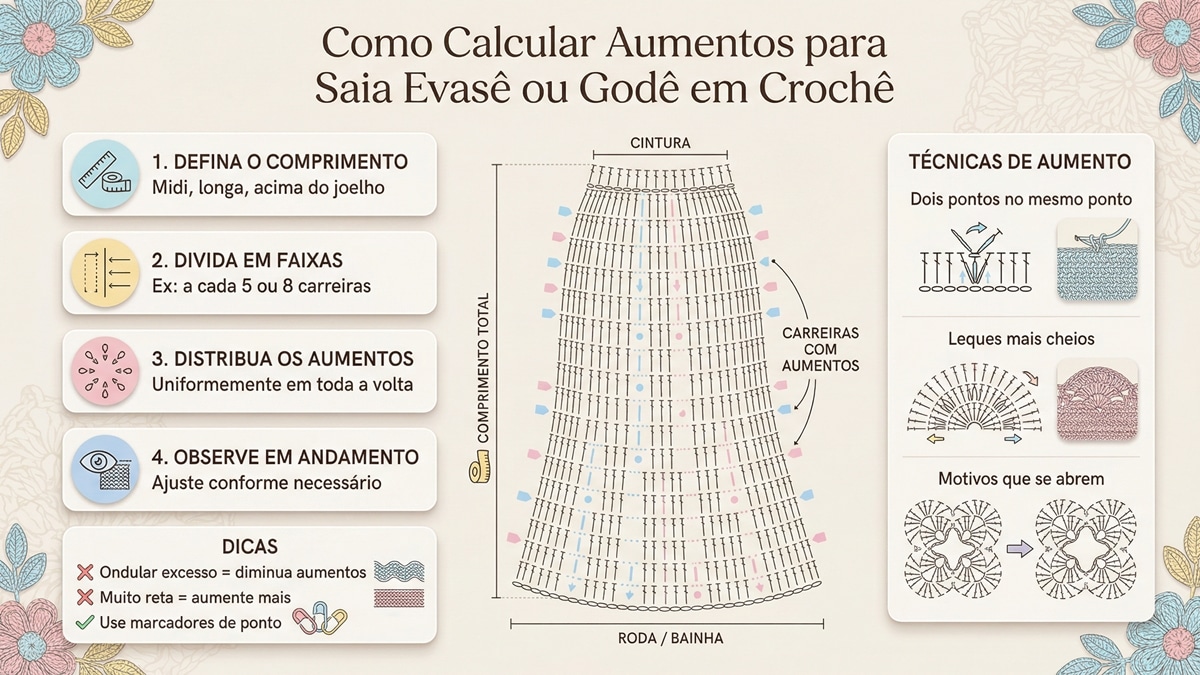 As saias de crochê evasê ou godê são queridinhas porque têm movimento bonito e caimento feminino. Para quem está começando, a dúvida é: como calcular os aumentos sem deformar o desenho ou criar “ondas” indesejadas?