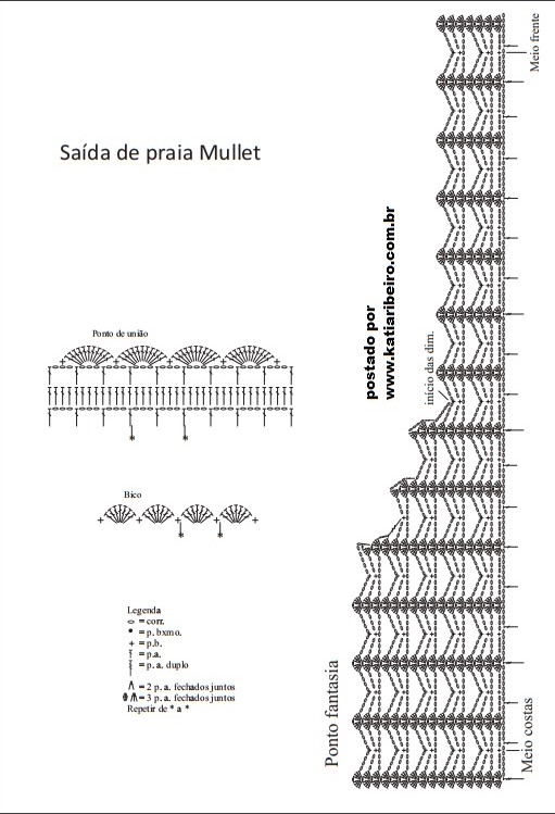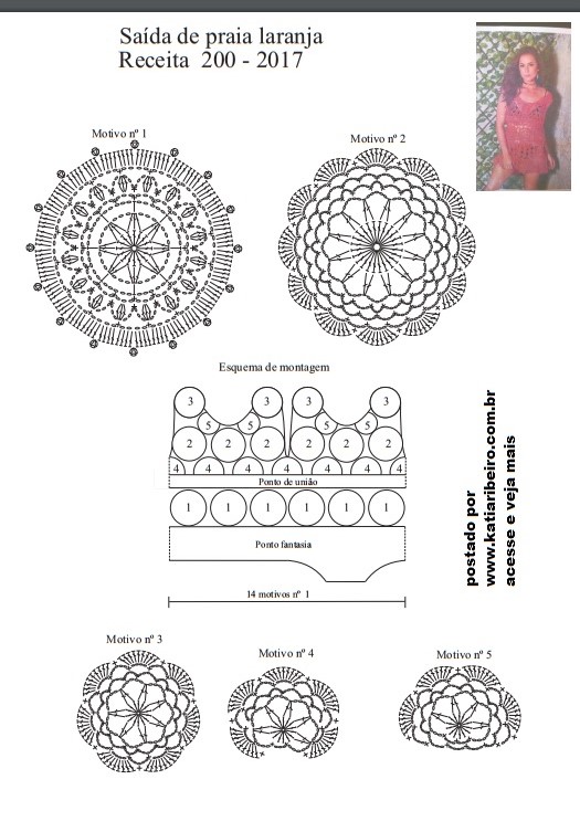 Frente e costas – São trabalhadas juntas. Comece pelos motivos, para todos os motivos faça uma corr. de 6 p. feche em círculo e trabalhe o motivo seguindo o gráfico correspondente. Faça 6 motivos nº 2, 4 motivos nº 3, 6 motivos nº 4 e 4 motivos nº 5, unindo-os entre si e nos outros motivos seguindo o esquema de montagem, durante a última carr.. Terminado os motivos faça no lado dos motivos 4, o ponto de união seguindo o gráfico. Terminado o gráfico rem.. Motivos nº 1 – Faça 6 motivos nº 1 seguindo o gráfico correspondente unindo-os entre si e no ponto de união seguindo o esquema de montagem. Terminado os motivos trabalhe em círculo e em p. fantasia seguindo o gráfico, observando as indicações do meio da frente e das costas. O gráfico repete 2 vezes. Terminado o gráfico rem.. Faça 14 motivos nº 1 seguindo o gráfico, unindo- os entre si e no ponto fantasia durante a última carr.. Faça a toda volta das cavas e do decote o bico seguindo o gráfico e rem..