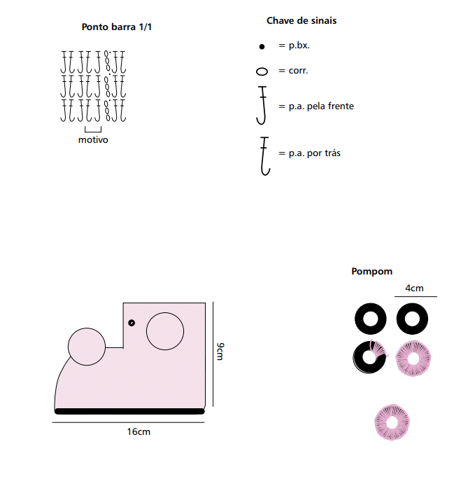 •ag. – agulha; arrem. – arrematar; carr. – carreira; corr. – correntinha; nov. – novelo; p. – ponto; p.a. – ponto alto; p.a. pela frente – faça o p.a. envolvendo o p. da carr. anterior da frente para trás; p.a. por trás – faça o p.a. envolvendo o p. da carr. anterior de trás para frente; p.b. – ponto baixo; p.bx. – ponto baixíssimo; trab. – trabalhe.