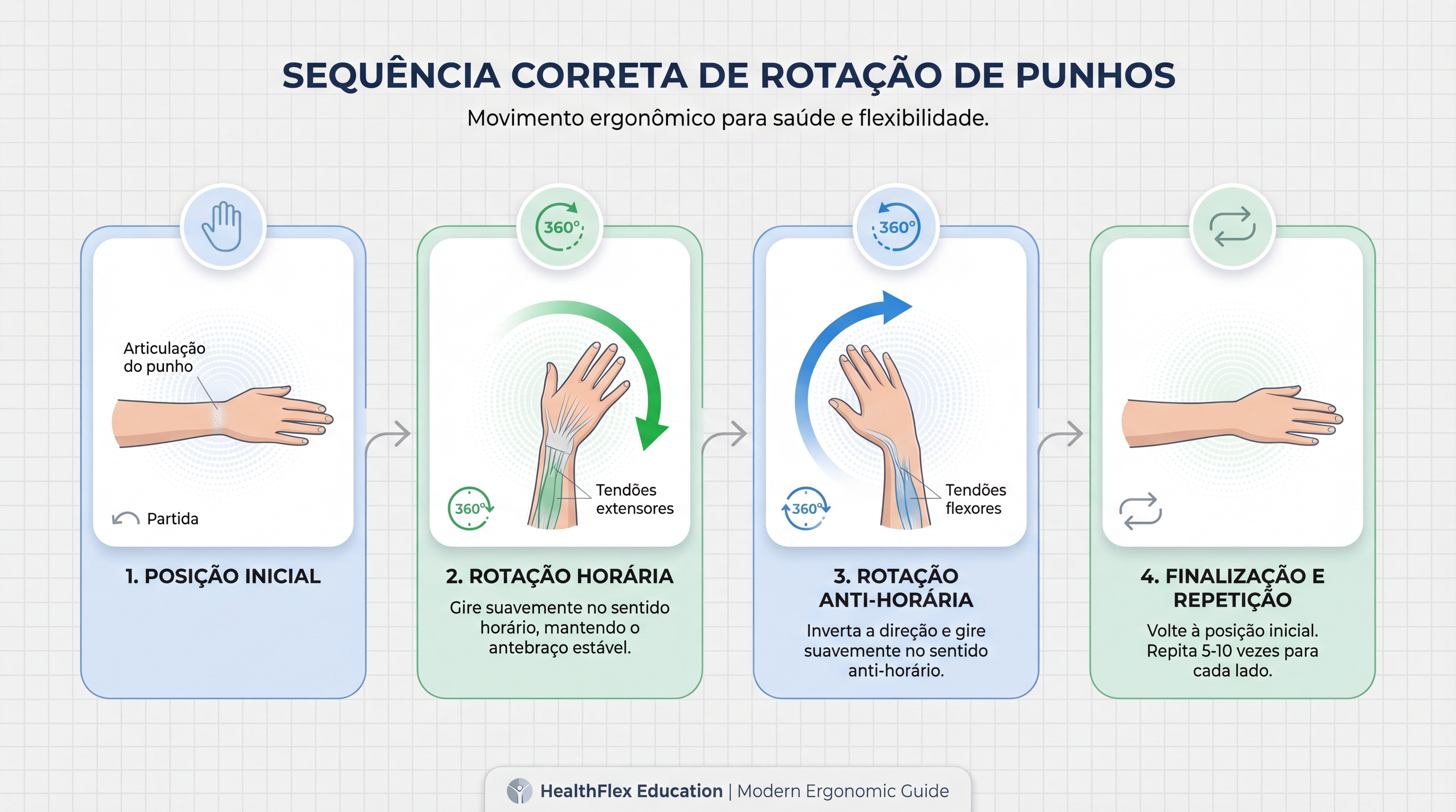 Além disso, o movimento circular ajuda a alongar as fáscias (tecidos que envolvem os músculos) do antebraço, que costumam estar encurtadas em quem trabalha no computador. Isso reduz a pressão interna no túnel do carpo, aliviando instantaneamente a sensação de peso e “queimação” no final do expediente.
