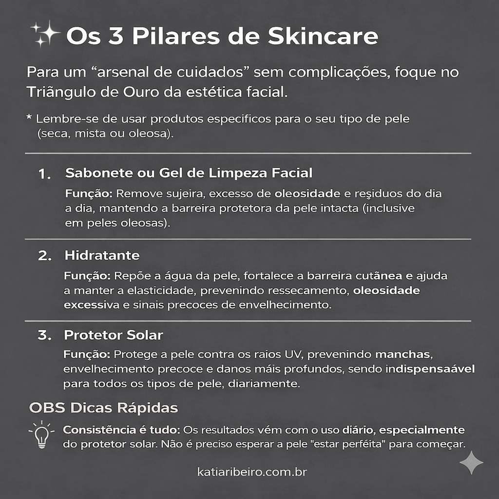 Para montar o seu arsenal de cuidados sem complicações, você só precisa de três itens que formam o triângulo de ouro da estética facial. Estes produtos devem ser escolhidos de acordo com o seu tipo de pele (seca, mista ou oleosa), mas a categoria permanece a mesma para todos: