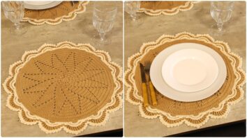 Para quem deseja produzir esse item em crochê, a execução segue uma sequência de pontos básicos bastante conhecida entre os praticantes dessa técnica manual. O resultado final é um sousplat com 40 cm de diâmetro, tamanho ideal para acomodar pratos e dar destaque à decoração da mesa. Um novelo de 400g do fio escolhido rende até quatro peças, possibilitando montar um conjunto harmonioso sem desperdício de material.