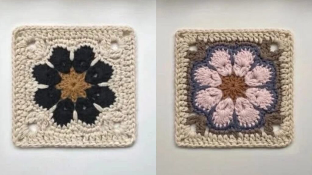 O square floral é uma variação do tradicional “granny square”, só que com uma flor como protagonista. A flor pode ser mais simples, como uma margarida, ou mais elaborada, como rosas em relevo ou flores tridimensionais. A base geralmente é feita com pontos altos, formando um quadrado firme e harmonioso.