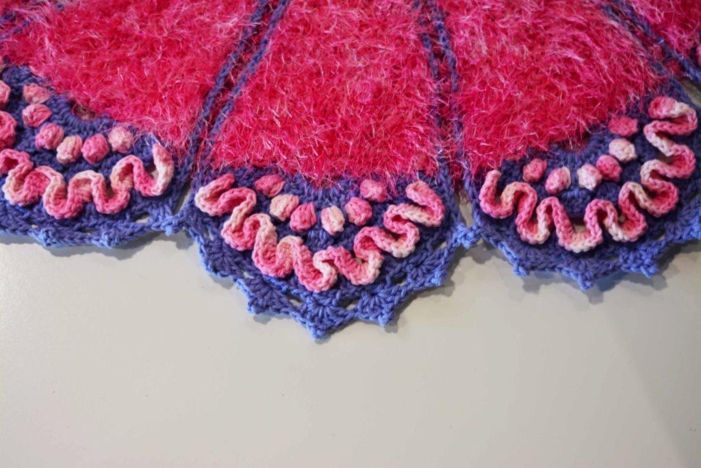 Contorno: com o fio Maxcolor na cor lilás, fazer o contorno seguindo o gráfico 2 ao redor do tapete. Fazer primeiro a parte em separado (1 leque). Obs.: na 2ª carr., trabalhar a técnica do fio conduzido, fazendo 1 p. alto, *retirar as últimas 2 laçadas da agulha com o fio rosa e manter o fio lilás esticado sobre os p. de base, fazer 1 p. pipoca com o fio rosa no p. alto seguinte, deixar o fio rosa esticado sobre os p. de base, 2 p. altos no p. alto seguinte*, 6x. Unir o fio lilás na lateral do 1º p. alto da 3ª carr. do gráfico 1 e fazer a 5ª carr. do gráfico 2, contornando os leques e as laterais dos grupos de p. altos do gráfico 1. Unir o fio lilás na parte de cima, no 2º arco de 3 corr. do leque, e fazer a 6ª carr. do gráfico 2, contornando o tapete.