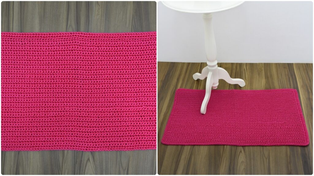 O acabamento é um passo crucial que confere à peça final um aspecto polido e profissional. Continue utilizando o mesmo fio usado no corpo do tapete. Na primeira carr. (carreira) dessa etapa, inicie com uma corr. (correntinha). Em cada canto do tapete, faça um ponto baixo, uma correntinha e outro ponto baixo. Essa técnica auxilia a manter os cantos da peça bem definidos.