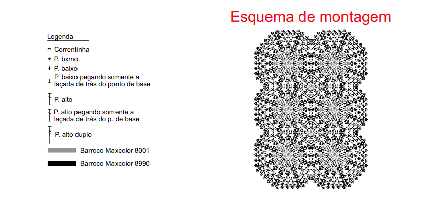 A união dos motivos é realizada com uma carreira de pontos baixíssimos (p. bxmo.), pegando na laçada de trás do ponto de base. Esta técnica assegura que os motivos fiquem firmemente unidos, formando o formato de diamante desejado.