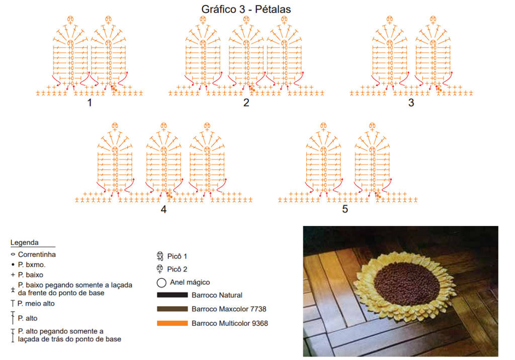 - Pétalas: Com o fio mescla de amarelo, formam-se 5 carreiras de pétalas, seguindo o gráfico 3. É crucial alternar a posição das pétalas a cada carreira.