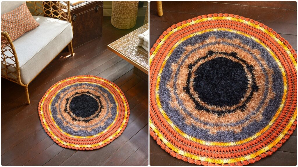 Com cerca de 80 cm de diâmetro, o tapete de crochê laranja Ipê pode ser posicionado tanto em salas quanto em quartos ou halls de entrada. Além do apelo visual, a escolha dos fios contribui para o conforto dos espaços e facilita na hora da higienização. As nuances entre o preto, prata, caravela, raio de sol, caqui e bronze se revezam formando um mosaico que chama atenção sem exageros, ideal para ambientes que buscam equilíbrio entre vivacidade e elegância.