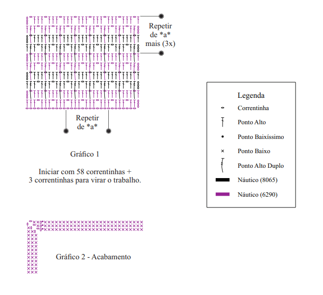 Abreviações: p. (Ponto), pts. (pontos), trab. (trabalhe ou trabalhando), ag. (agulha), rep. (repetição ou repetições), rem. (rematar), acomp. (acompanhando), corr. (Correntinha), p.b.x. (Ponto Baixíssimo), carr. (Carreira); laç. (Laçada); p.b. (Ponto Baixo); p.a. (Ponto Alto); p.a.d. (Ponto Alto Duplo).