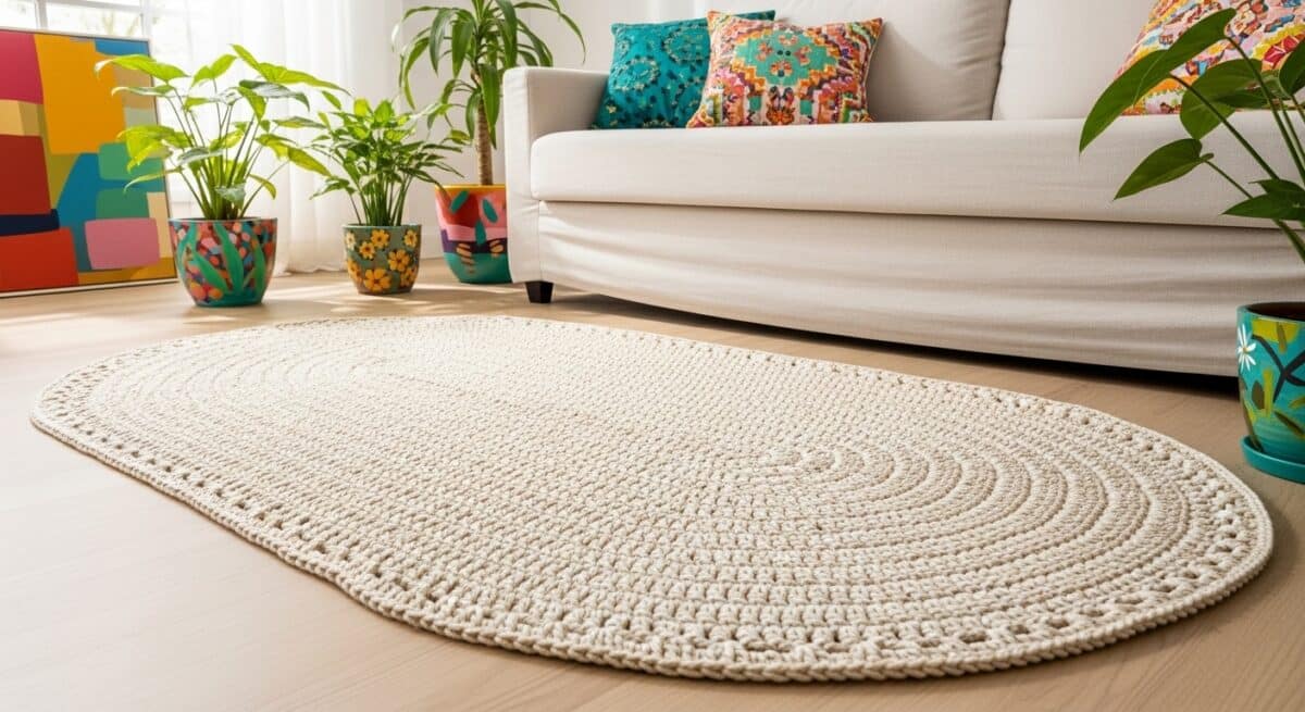 O tapete de crochê oval é peça coringa: contorna móveis, não bloqueia passagem e funciona do lavabo à sala. Em vez de decorar receitas, pense a estrutura: retângulo central + duas meias-luas. Nas retas você segue regular; nas curvas, abre com aumentos bem distribuídos para não ondular nem “embicar”. Use a fórmula da corrente inicial (comprimento − largura) e faça uma volta de assentamento (pb ou mpa pela alça de trás) antes do bico. Ajuste fio, agulha e ponto ao uso (mpa em áreas molhadas; pa em salas/quartos) e estime o consumo com uma amostra 10×10 cm. Pronto: técnica no lugar, liberdade para criar qualquer tamanho e estilo.