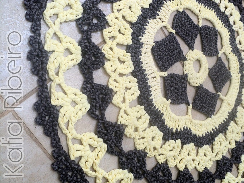 e encantada que sou com os trabalhos da Helena Maria Caldas do blog Eu também crocheto me lembrei que faz mais de 2 anos que tinha 2 cones de fios de malha parados aqui e resolvi enfrentar a agulha 9 “uma tora como diz a minha amiga Cinthia rs” , o início fiz como este modelo AQUI ( aproveitem para seguir o blog ) , fui executando e como percebi que poderia fazer um tapete maior, esse ficou com 1:10 mtrs de diâmetro arrisquei , fiz umas carreiras de leques à mais e ficou bem legal, gostei muito também do efeito destas duas cores (amarelo limão com cinza estampado ) e “olha que quando comprei tinha propósitos totalmente diferentes rs “