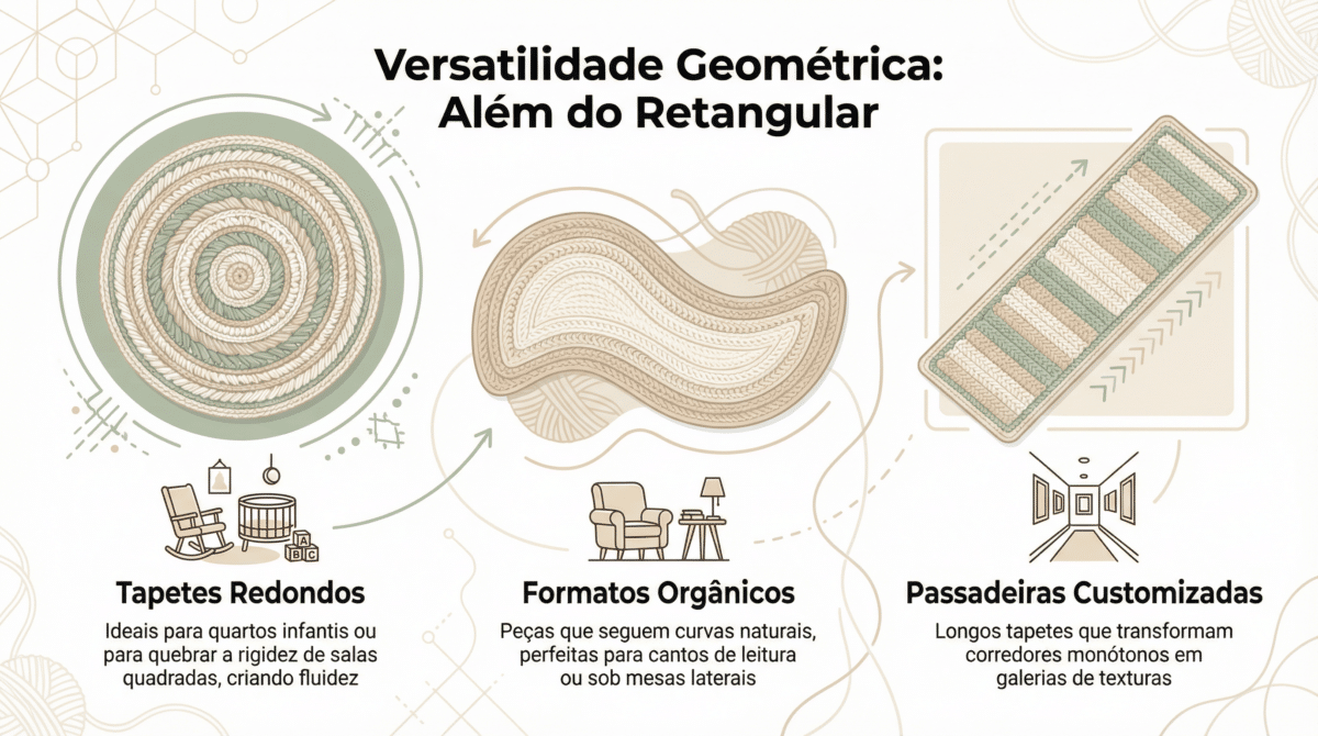 Uma das maiores liberdades do crochê é a capacidade de criar formas que se adaptam à arquitetura do imóvel. Enquanto a indústria foca no padrão, o artesanato explora:
