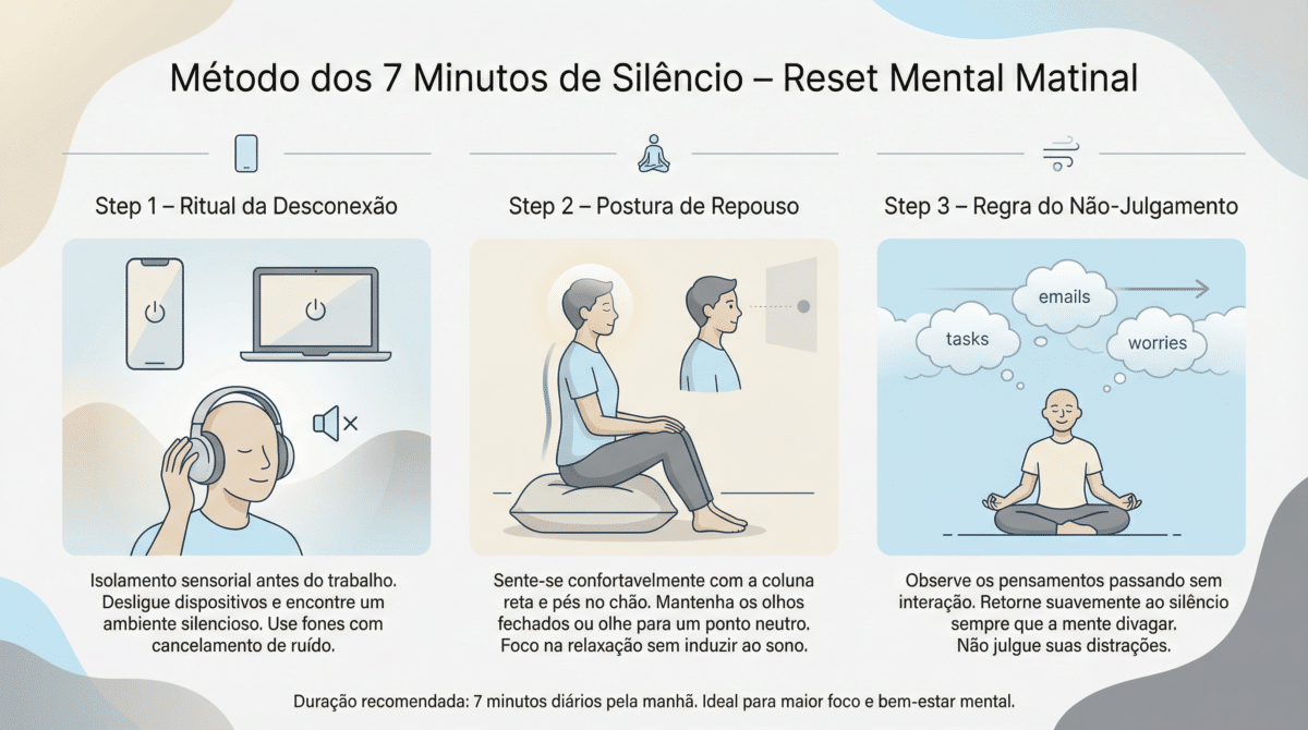 Começar o dia já checando notificações e e-mails é o caminho mais curto para o esgotamento mental precoce. Especialistas em neurociência de Stanford afirmam que o cérebro humano em 2026 está sofrendo com uma “crise de atenção” devido ao bombardeio constante de dados. A técnica dos 7 minutos de silêncio surge como uma ferramenta de alta performance para limpar o excesso de dopamina e preparar a mente para o foco profundo.