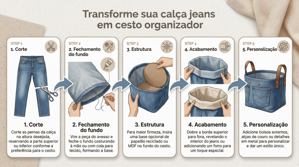 Para um visual mais “Premium”, você pode manter os bolsos originais da calça na lateral do cesto. Eles são excelentes para guardar itens pequenos como pinças, elásticos de cabelo ou cortadores de unha. Outra dica de 2026 é adicionar alças de couro (pode ser de um cinto velho) fixadas com rebites metálicos, o que eleva instantaneamente o status da peça de “artesanato caseiro” para “objeto de design”.