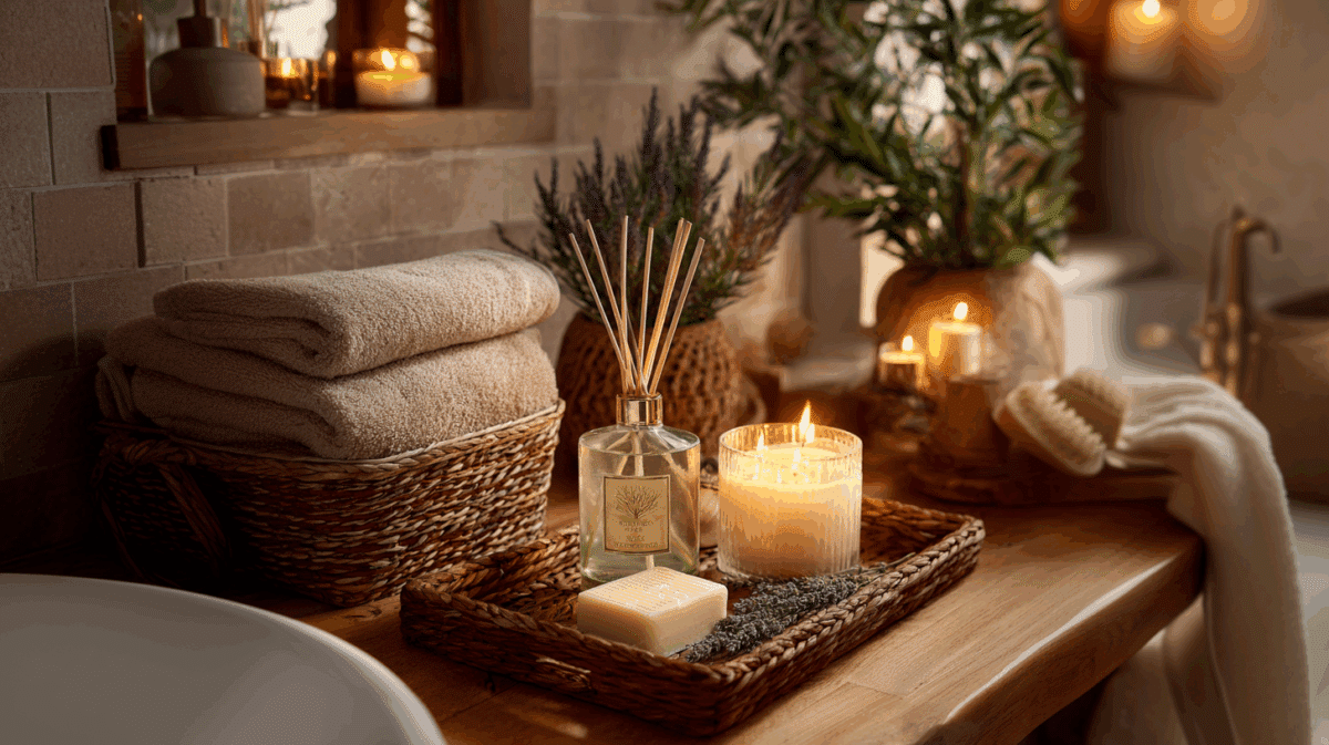 - Velas aromáticas com notas de lavanda, chá branco ou sândalo para acalmar a mente.