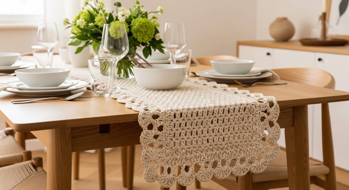 Um trilho cru em trama lisa combina com louça branca, copos transparentes e guardanapos de linho — o clássico que não erra. Quer calor visual? Entre com um filete terracota ou verde musgo na borda e florzinhas da mesma paleta. Em mesas escuras, tons areia e off-white criam contraste chique; em mesas claras, cinza-pedra e cáqui deixam o conjunto sofisticado. Para fotos, luz natural lateral e um arranjo baixo (para não bloquear conversa) valorizam a textura do crochê.