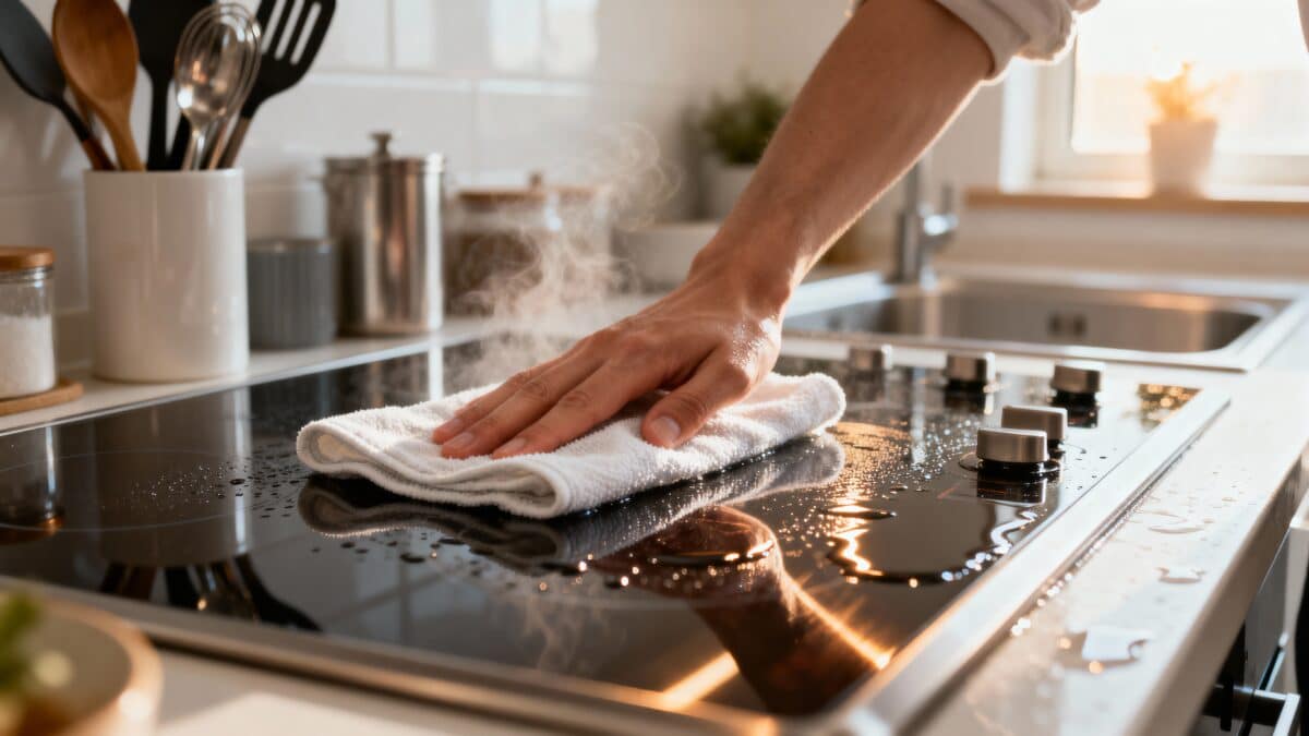 A gordura quente é muito mais fácil de remover do que a fria e grudada. Terminou de cozinhar? Passe um pano úmido com detergente e vinagre no fogão ainda morno — ele vai brilhar!