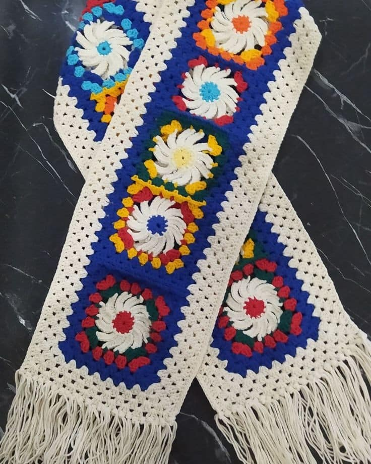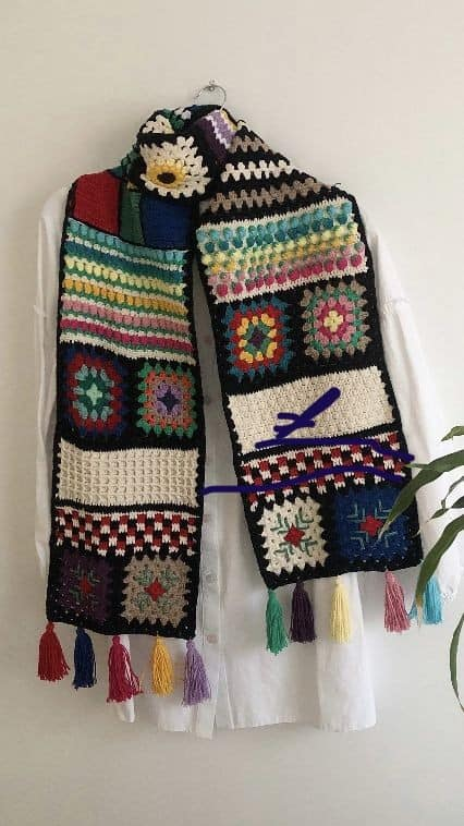- Cachecol em crochê com squares coloridos estilo patchwork.