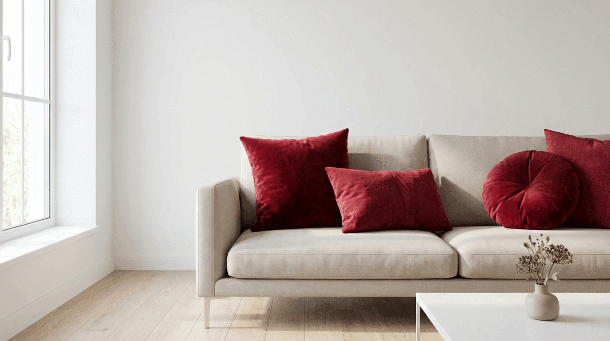 - Sofá neutro (bege, cinza ou cru) com almofadas vermelho cereja.