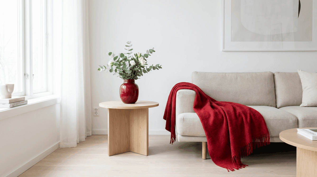 Uma boa base é misturar branco, off-white, bege, cinza claro e madeira clara. Eles criam um fundo suave onde o vermelho entra só como detalhe, sem brigar com o restante da decoração.