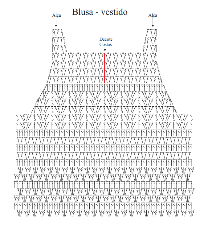 Ao seguir o esquema, é importante observar a ordem de pontos e cores. Quando o trabalho atingir a altura adequada, divida-o em frente e costas, continuando em separado. Assim, a saia ganha forma e estrutura.