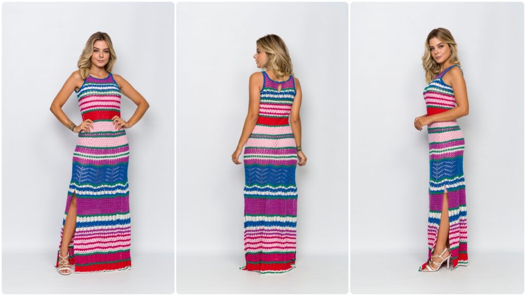 No geral, o vestido de crochê Íris, com sua variedade de cores e pontos, é uma peça que demonstra a beleza e a complexidade do trabalho artesanal, trazendo estilo e exclusividade a quem o veste.