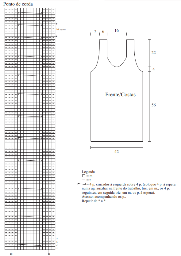 Frente e costas – São iguais. Monte 88 p. nas ag. nº 6,0 mm, tric. 2 carr. em p. tricô, em seguida tric. em p. de corda seguindo o gráfico, repita de * a * no sentido das carr. (10 v.) conforme indicado no gráfico. A 56 cm do início do trabalho para as cavas rem. de cada lado 3 p., em seguida rem. de cada lado a 3 p. (tric. esses 2 p. em p. meia) da borda cada 2 carr.: 2 p. (4 v.) e 1 p. (2 v.). Ao mesmo tempo a 60 cm do início do trabalho para o decote, divida o trabalho em duas partes iguais e trabalhe cada lado separadamente. Rem. do lado do decote a 2 p. da borda cada 2 carr.: 2 p. (5 v.) e 1 p. (7 v.). A 82 cm do início do trabalho rem..