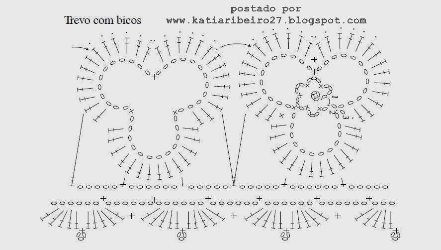 carr. e termine com a 9ª carr. do diagrama. Trab. um total de 23 trevos unidos entre si com p.bx. e prendaos com p.bx. à borda inferior do vestido. Arrem. com os bicos na outra borda dos trevos, distribuindo um total de 34 bicos.