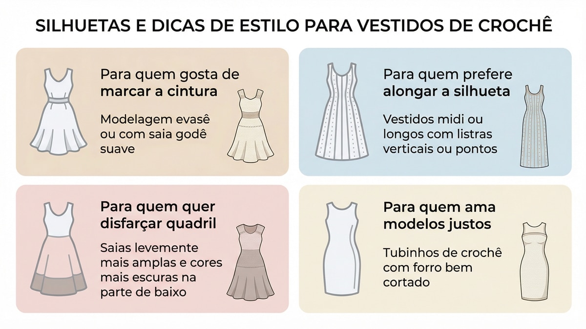 A escolha da modelagem é essencial para que o vestido de crochê elegante vista bem e seja confortável. Como o crochê tem certa elasticidade, é importante pensar em onde você quer mais ajuste e onde prefere soltura.