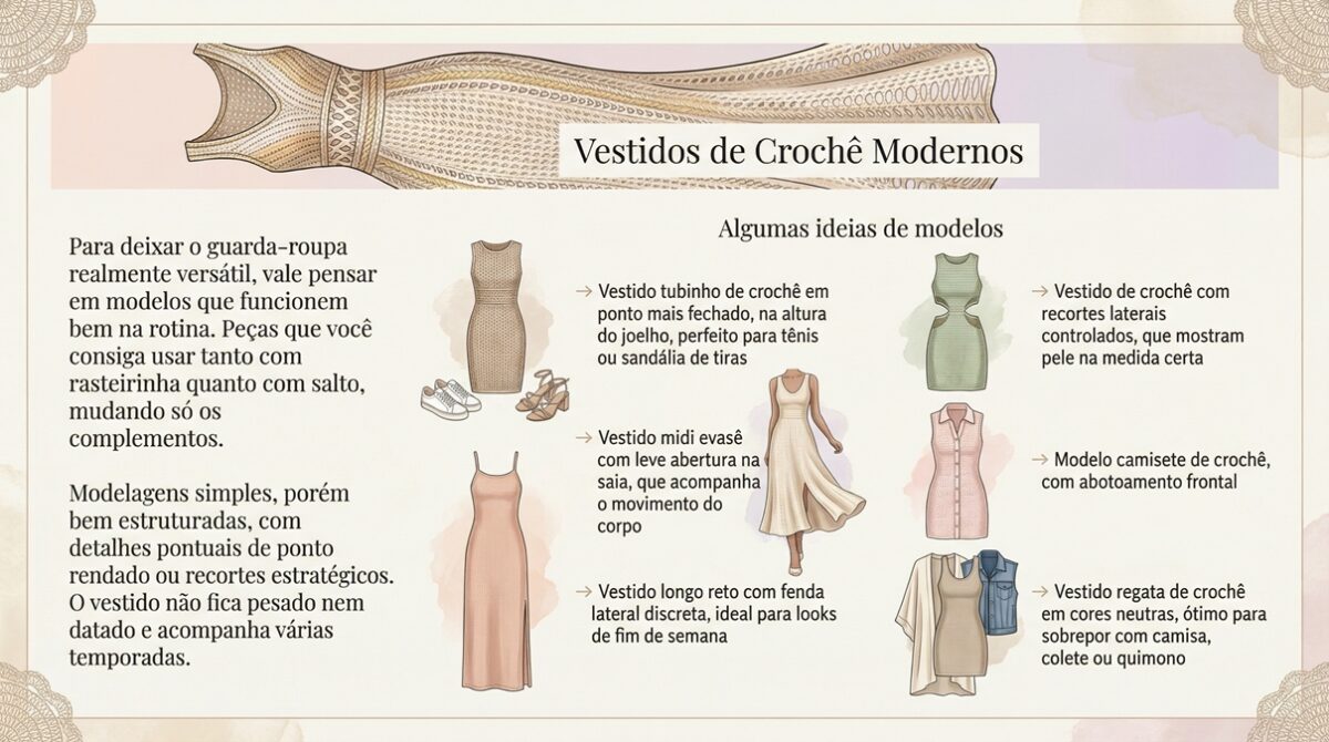 Os vestidos de crochê modernos provaram que o crochê pode, sim, fazer parte do dia a dia com muito estilo. Ao escolher modelagens interessantes, pontos bem pensados, fios adequados e uma paleta de cores atual, você ganha peças frescas, confortáveis e com cara de moda, não apenas de praia.