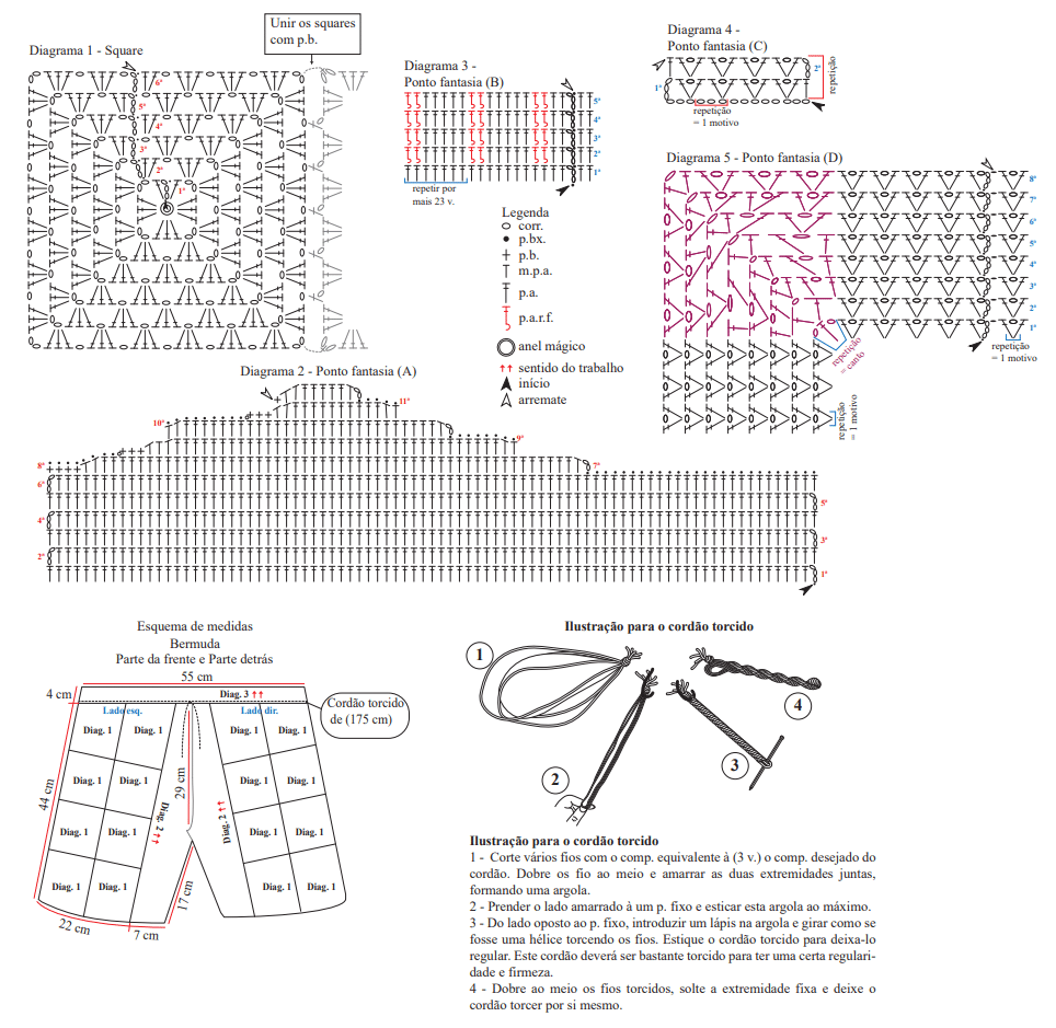 Pontos utilizados no crochê: corr.: correntinha, p.bx.: ponto baixíssimo, p.b.: ponto baixo, m.p.a.: meio ponto alto, p.a.: ponto alto, p.a.r.f.: p. alto em relevo pegando pela frente do p. da carr. anterior, square: siga o diag. 1, p. fantasia (A): siga o diag. 2, p. fantasia (B): siga o diag. 3, cordão torcido: siga a ilustração.