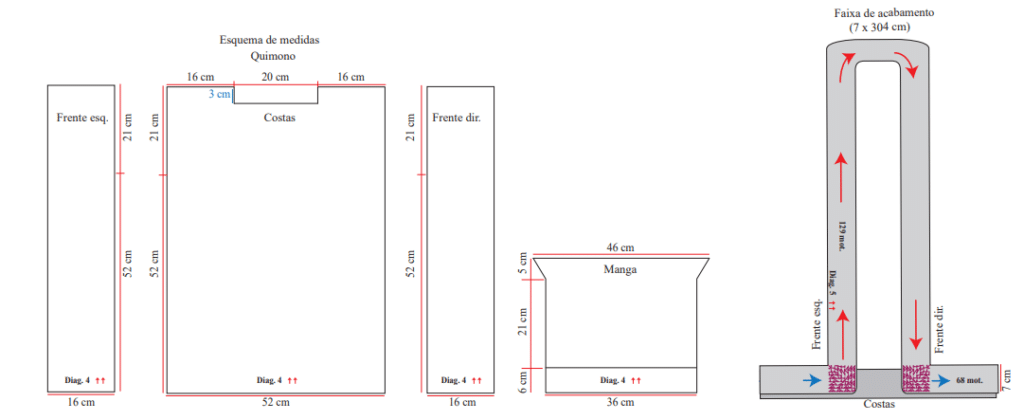 OBS.: Em cada canto da parte inferior da frente dir. e frente esq. trab. o canto. Na frente esq. decote costas e frente dir. trab. (129 mot. por carr.). Na barra do quimono trab. (68 mot. por carr.).