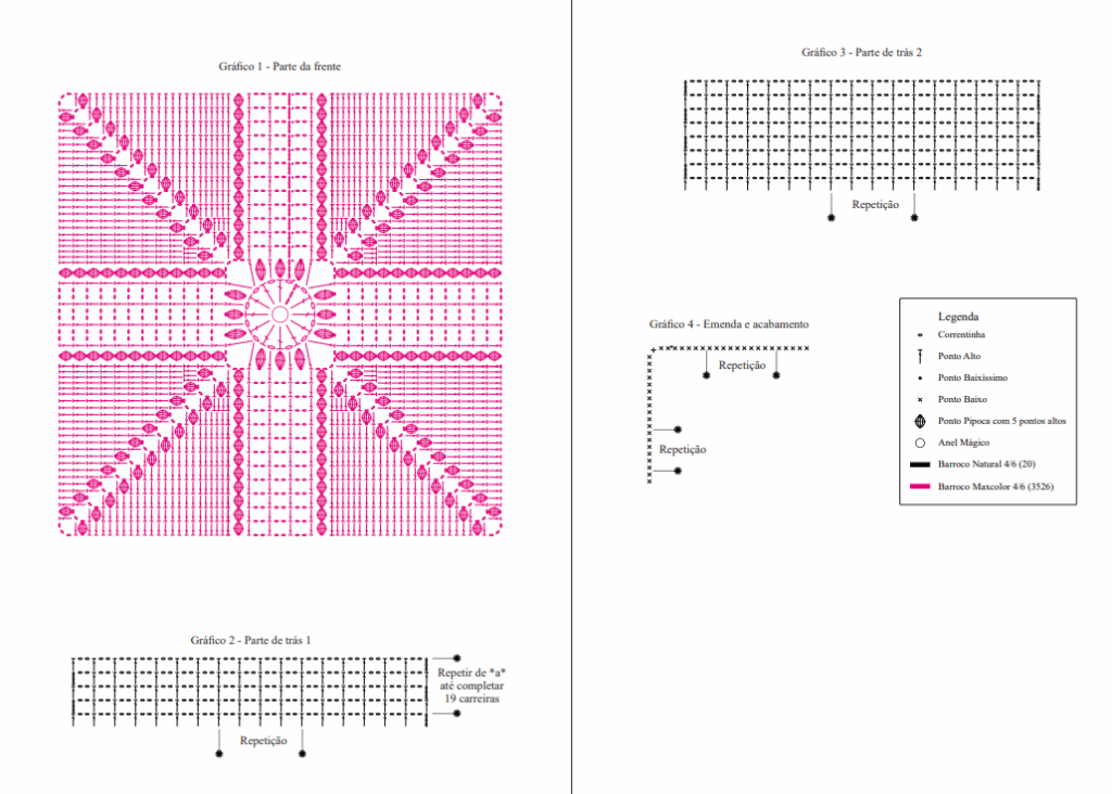 Abreviações: p. (Ponto), pts. (pontos), trab. (trabalhe ou trabalhando), ag. (agulha), rep. (repetição ou repetições), rem. (rematar), acomp. (acompanhando), corr. (Correntinha), p.b.x. (Ponto Baixíssimo), carr. (Carreira); laç. (Laçada); p.a. (Ponto Alto); p.b. (Ponto Baixo), p.p. (Ponto Pipoca com 5 pontos altos).