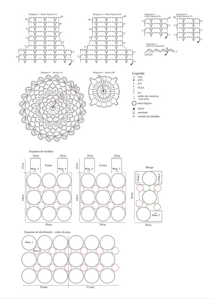 Corr.: correntinha, p.bx.: ponto baixíssimo, p.b.: ponto baixo, m.p.a.: meio ponto alto, p.a.: ponto alto, roseta (A): siga o diag. 1, Roseta (B): siga o diag. 2, ponto fantasia (C): siga o diag. 3, ponto fantasia (D): siga o diag. 4, ponto fantasia (E): siga o diag. 5, ponto fantasia (F): siga o diag. 6, bico de acabamento: siga o diag. 7.