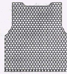 Costas – Com o fio Mollet e as ag. nº 5,5mm monte 74 p. e tric. em barra 1/1. A 6 cm do início do trabalho passe para o fio Açucena e as ag. nº 6,00mm e tric. em p. meia. A 28 cm do início do trabalho para as cavas rem. de cada lado cada 2 carr.: 3 p., 2 p. e 1 p.. A 52 cm do início do trabalho rem..