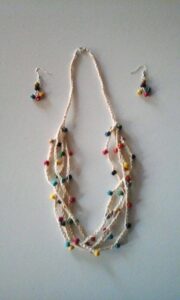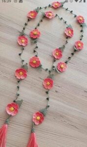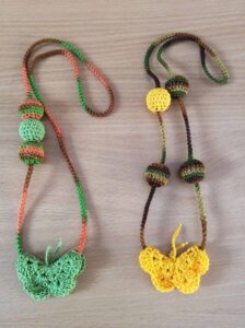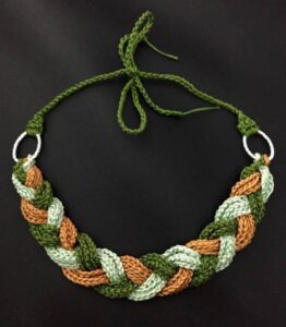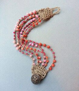 - Colares: desde modelos delicados até peças maiores, que mesclam pontos de crochê com outros materiais para criar texturas únicas.