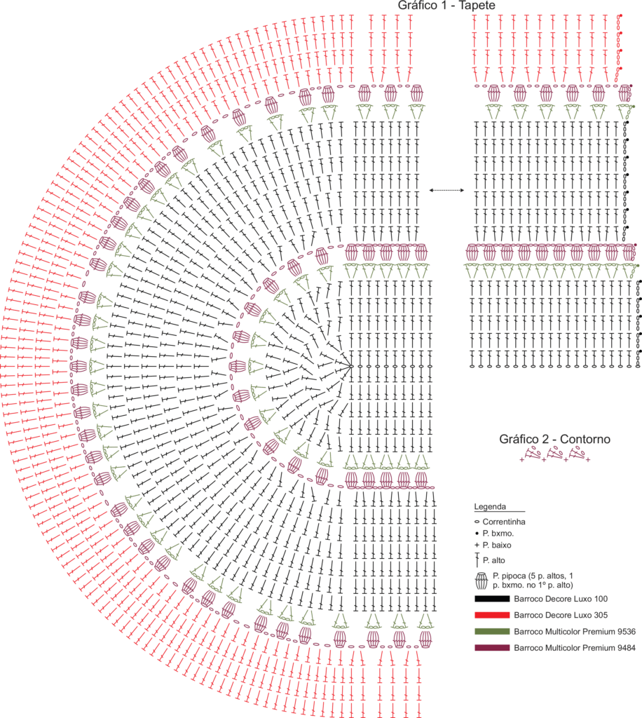 Tapete: com o fio na cor branca, fazer 130 correntinhas mais 3 corr. para virar e seguir o gráfico 1. Observar a troca de cor dos fios no gráfico.
