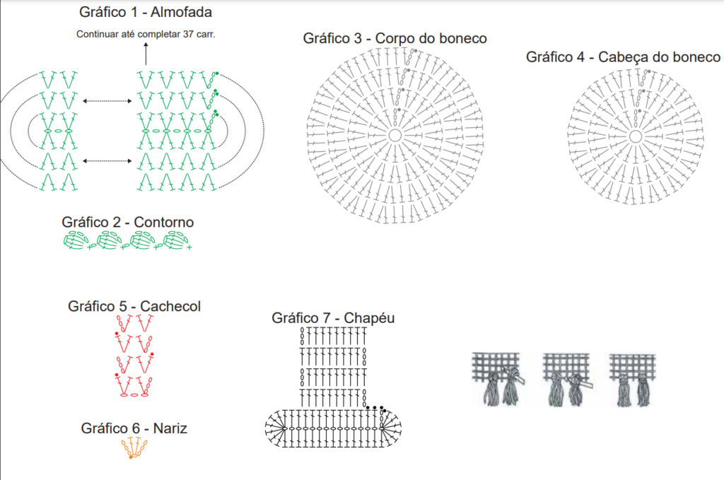 - Almofada: Com o fio verde, iniciar com 65 correntinhas mais 3 para virar. Siga o gráfico 1, trabalhando de maneira tubular. Contorne a peça conforme o gráfico 2, unindo a parte de trás e deixando uma abertura de 35 cm.