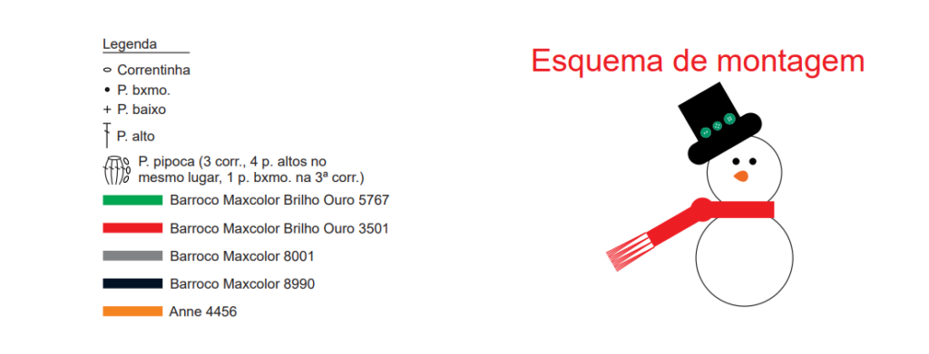 - Cachecol: Com o fio vermelho, faça 3 correntinhas mais 3 para virar e acompanhe o gráfico 5 por 20 carreiras. Adicione franjas com fios de 14 cm nas pontas do cachecol.