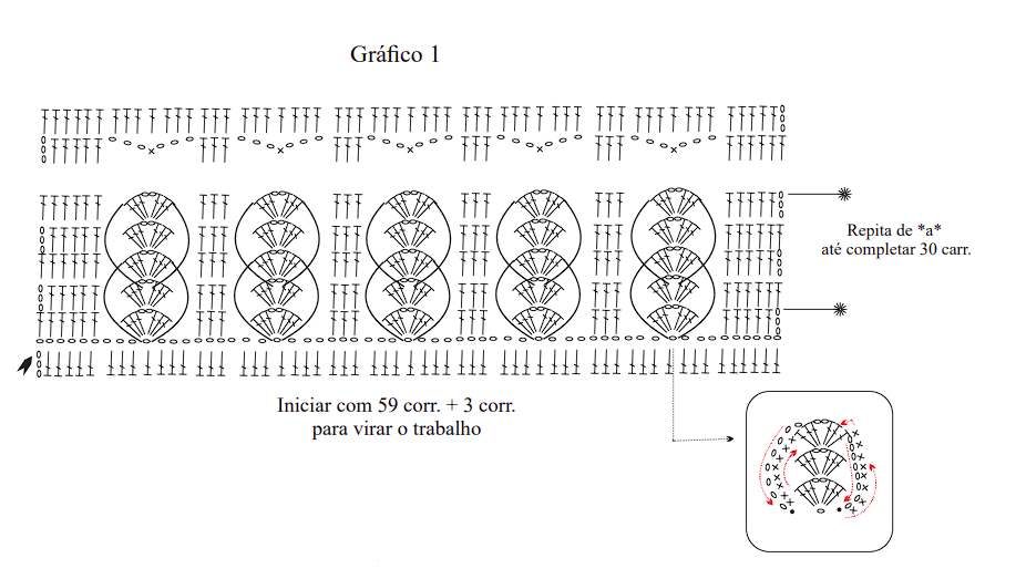 Após completar o corpo principal da almofada seguindo o primeiro gráfico, o passo seguinte é iniciar o acabamento com o gráfico 2 e 3. O segundo gráfico começa com a formação de um anel de seis correntinhas. A partir desse anel, o trabalho prossegue com a formação dos tradicionais leques de crochê, que serão unidos posteriormente à parte frontal da almofada.