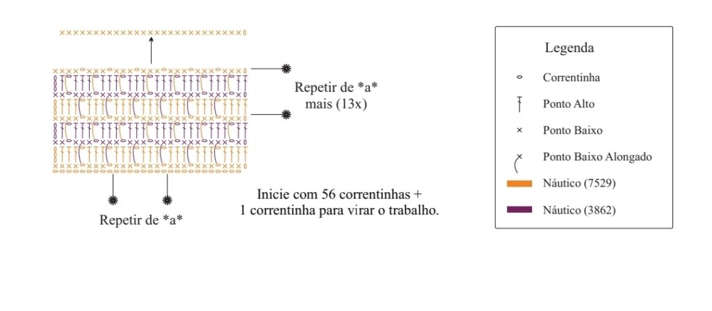 Abreviações: p. (Ponto), pts. (pontos), trab. (trabalhe ou trabalhando), ag. (agulha), rep. (repetição ou repetições), rem. (rematar), acomp. (acompanhando), corr. (Correntinha), carr. (Carreira); laç. (Laçada); p.a. (Pont Alto); p.b. (Ponto Baixo), p.b.a. (Pnto Baixo Alongado).