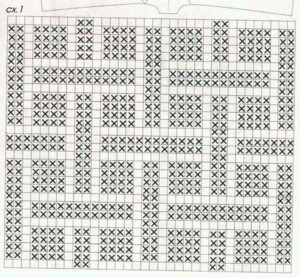 Amostra: um quadrado de 10 cm, em p. fantasia, feito com fio Verão e ag. 2,5 mm = 20 pts. x 10 carr.