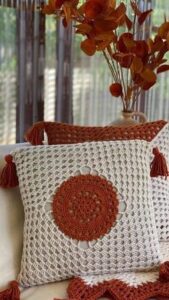 - Misture Texturas: Combine as almofadas de crochê com outros tecidos e texturas para adicionar interesse visual. Misturar crochê com veludo, linho ou algodão cria uma estética visualmente rica e convidativa.