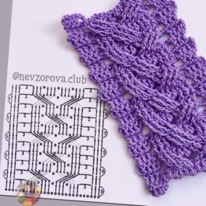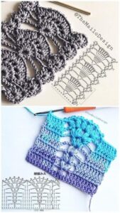 Abreviações: p. (Ponto), pts. (pontos), trab. (trabalhe ou trabalhando), ag. (agulha), rep. (repetição ou repetições), rem. (rematar), acomp. (acompanhando), corr. (Correntinha), p.b.x. (Ponto Baixíssimo), carr. (Carreira); laç. (Laçada); p.b. (Ponto Baixo), p.a. (Ponto Alto); p.a.r.f. (Ponto Alto Relevo pegando pela frente), p.a.r.t. (Ponto Alto Relevo pegando por trás).