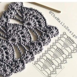 1ª carr.: volte trab. na 4ª corr. a contar da ag. 3 p.a., * pule 3 pts. de base, trab. 3 p.a. 2 corr. e 3 p.a. no mesmo p. de base, pule 3 pts. de base, 3 p.a. * rep. de *a* mais (9x), finalize com 1 p.a. sobre o último p. de base.