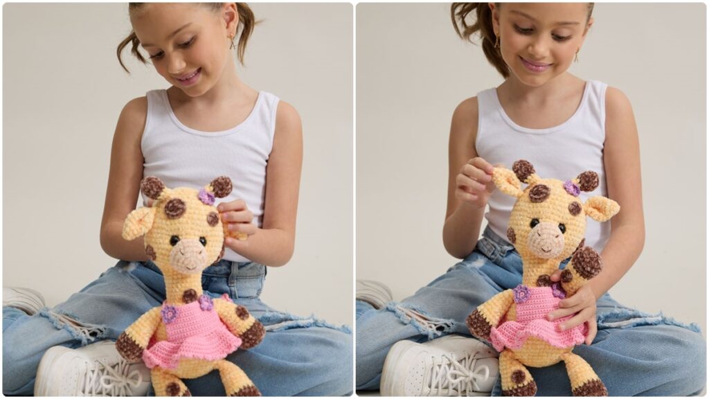 O toque final é garantido pelo vestido, trabalhado com fio Slim. Diferentemente das demais etapas, essa parte utiliza correntinhas para se ajustar à medida da cintura da girafa. A saia ganha volume com aumentos de meio ponto alto, enquanto o peitoral é feito em carreiras de ida e volta, finalizado por alças que cruzam nas costas. Três pequenas flores de crochê, posicionadas estrategicamente no vestido e na antena, dão um charme especial.
