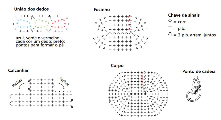 •Pé – comece pelos dedos: faça 4 corr., feche em círculo com 1 p.bx. e trab. em carr. circulares. 1ª carr.: 8 p.b. no anel. 2ª carr.: distribua uniformemente 3 aumentos na carr. (= 11 p.). Siga reto. A 11 carr. do começo, deixe à espera. Faça mais 2 dedos iguais a esse. Em seguida, junte os dedos e trab. 27 p.b. em toda a volta, como mostra o diagrama da união dos dedos. No final, feche em círculo com 1 p.bx. Trab. 8 carr. circulares.
