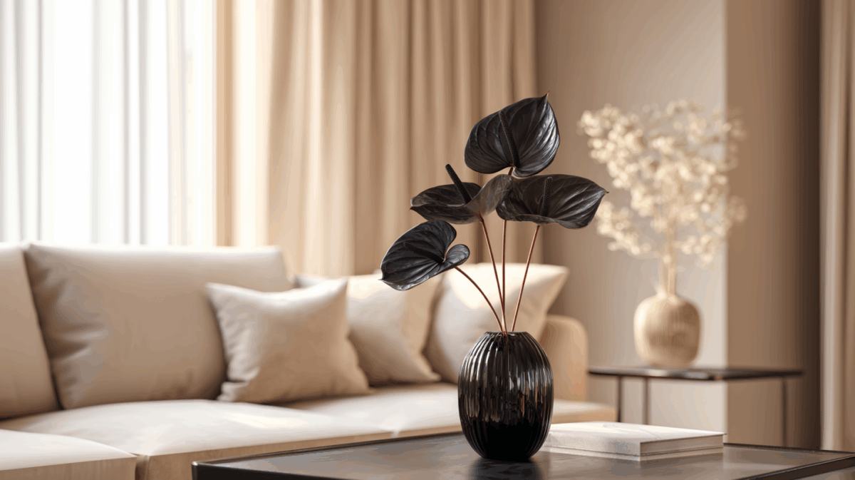 O antúrio preto se tornou tendência para decorações impactantes. Ele adiciona profundidade e cria contraste marcante em salas de estar e escritórios.