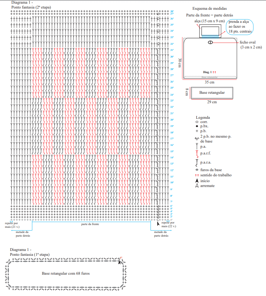 Corr.: correntinha, p.bx.: ponto baixíssimo, p.b.: ponto baixo, 2 p.b. no mesmo p. de base: 2 pts. baixos no mesmo p. de base, p.a.: ponto alto, p.a.r.f.: p. alto em relevo pegando pela frente do p. da carr. anterior, p.a.r.a.: p. alto em relevo pegando por trás do p. da carr. anterior, p. fantasia (1ª e 2ª etapas): siga o diag. 1.