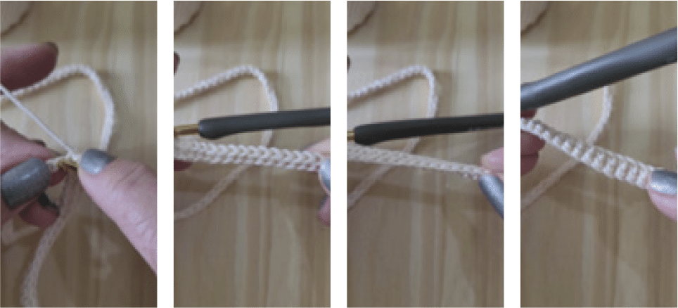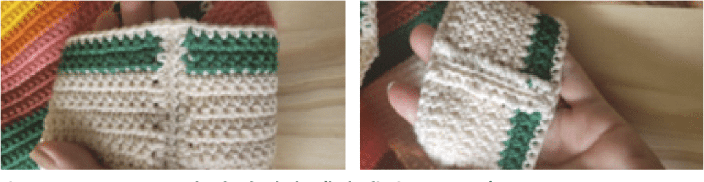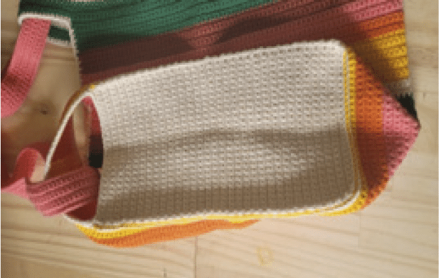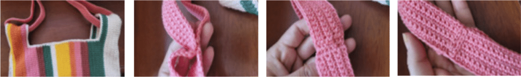 Para costurar as 2 abas das alças, tecer 1 carr de pb em cada aba com o fio na cor 004 (cru) no